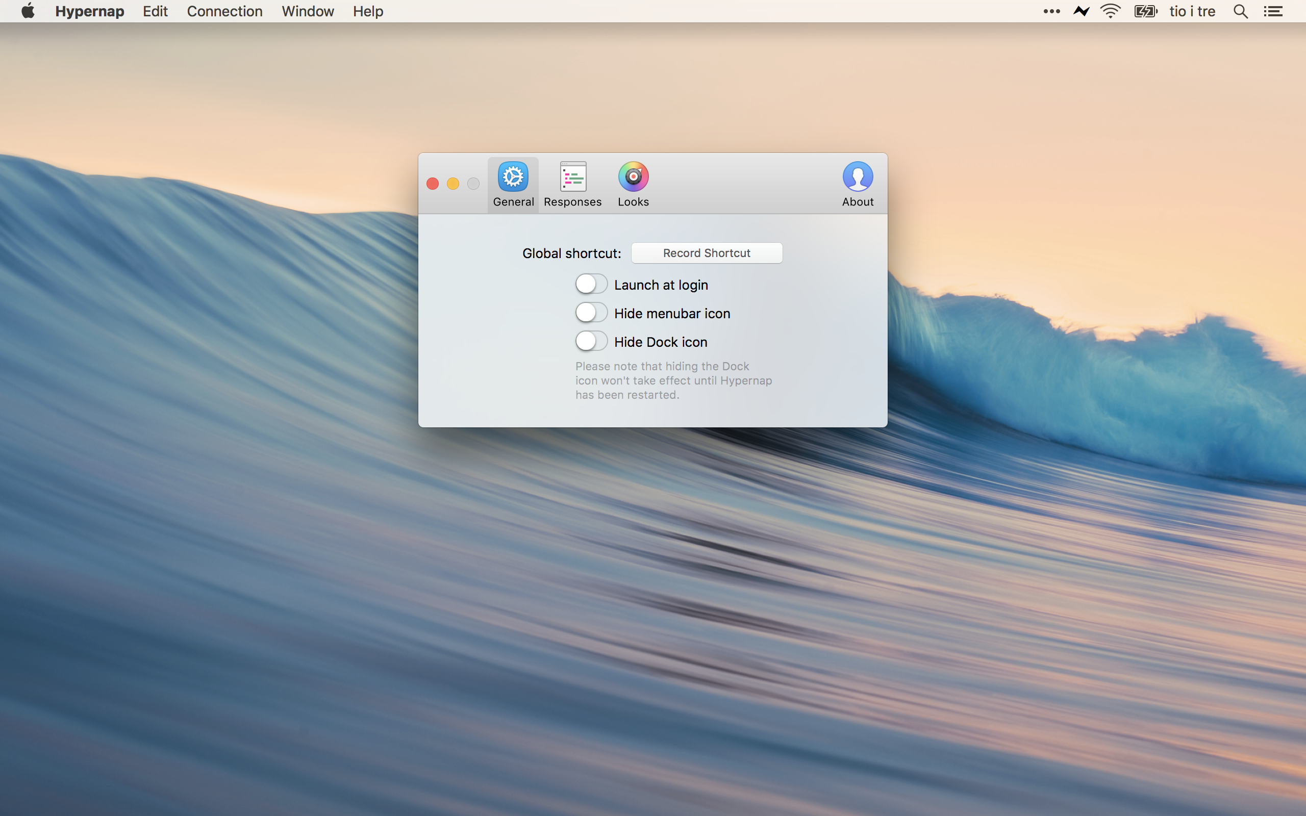 Hypernap has a lot of preferences available to make it fit your workflow better. You can choose to hide the Dock-icon or the menuicon if you don't want them, and set a global hotkey for quick access.